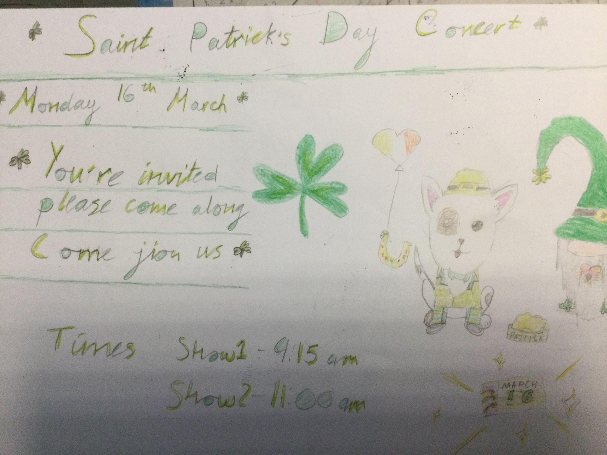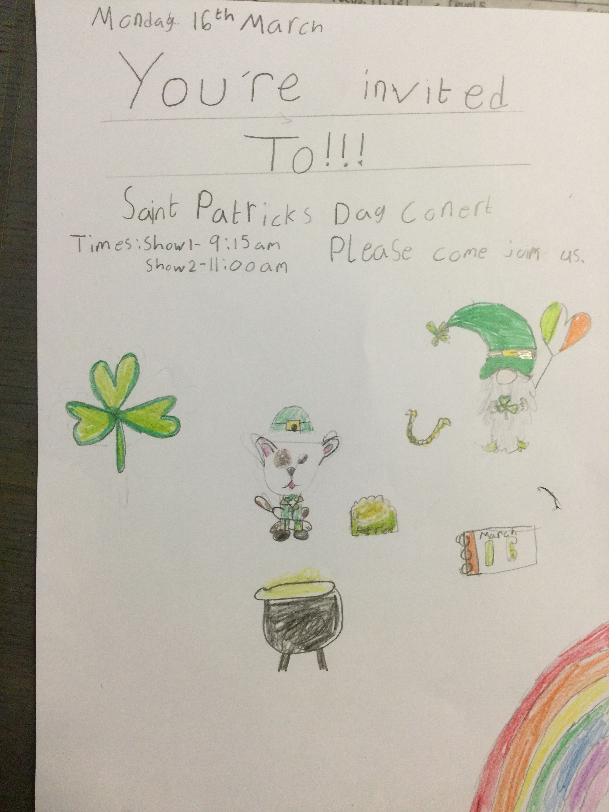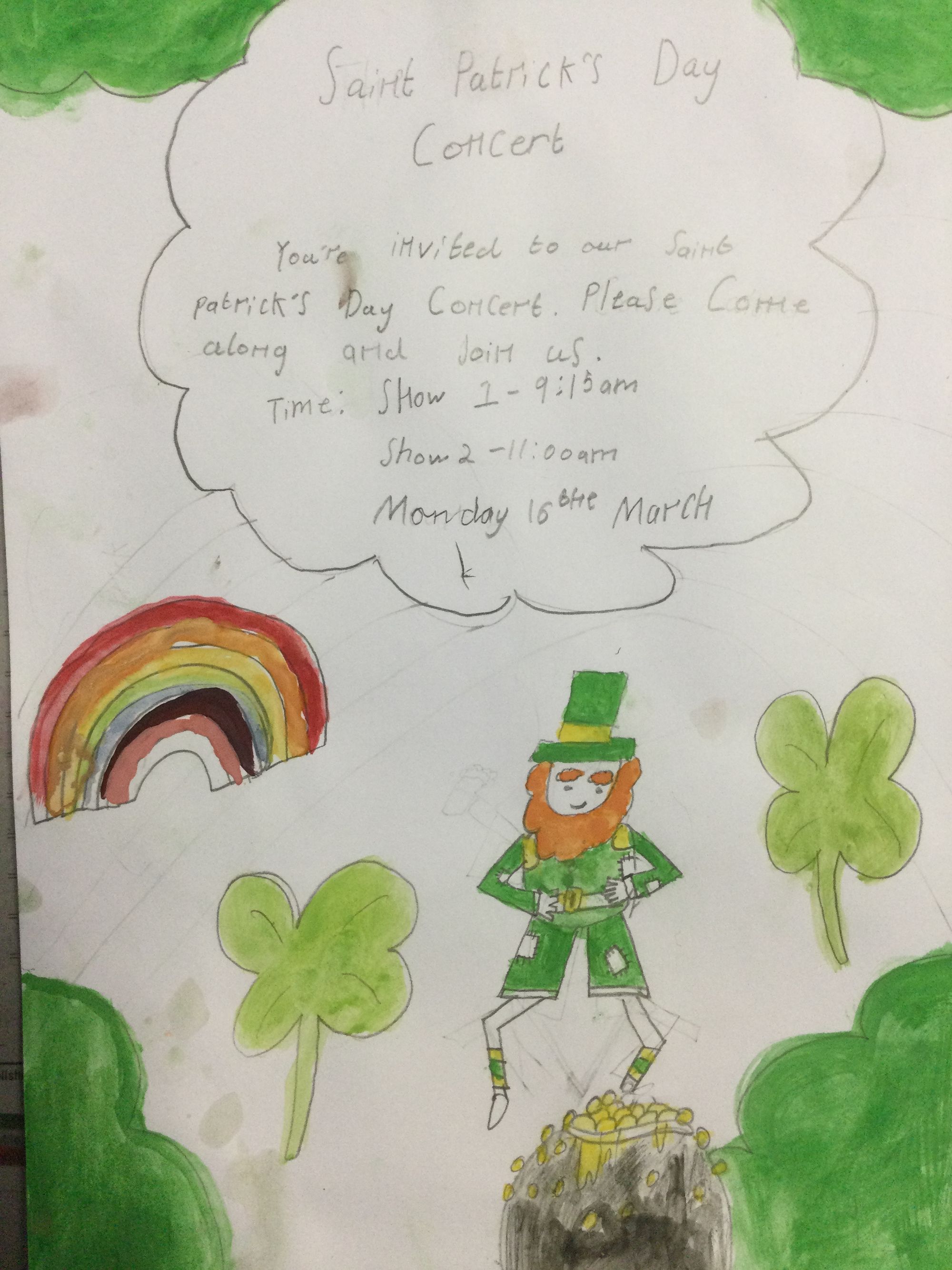 Come along to our fantastic Saint Patrick’s Day Concert. Published: 16th Mar, 2026 6A - Mrs AM Darmody Prev article Reminder Next article Year 6 After School Class Reward✨ Share Tweet Send 0 Comments Loading...