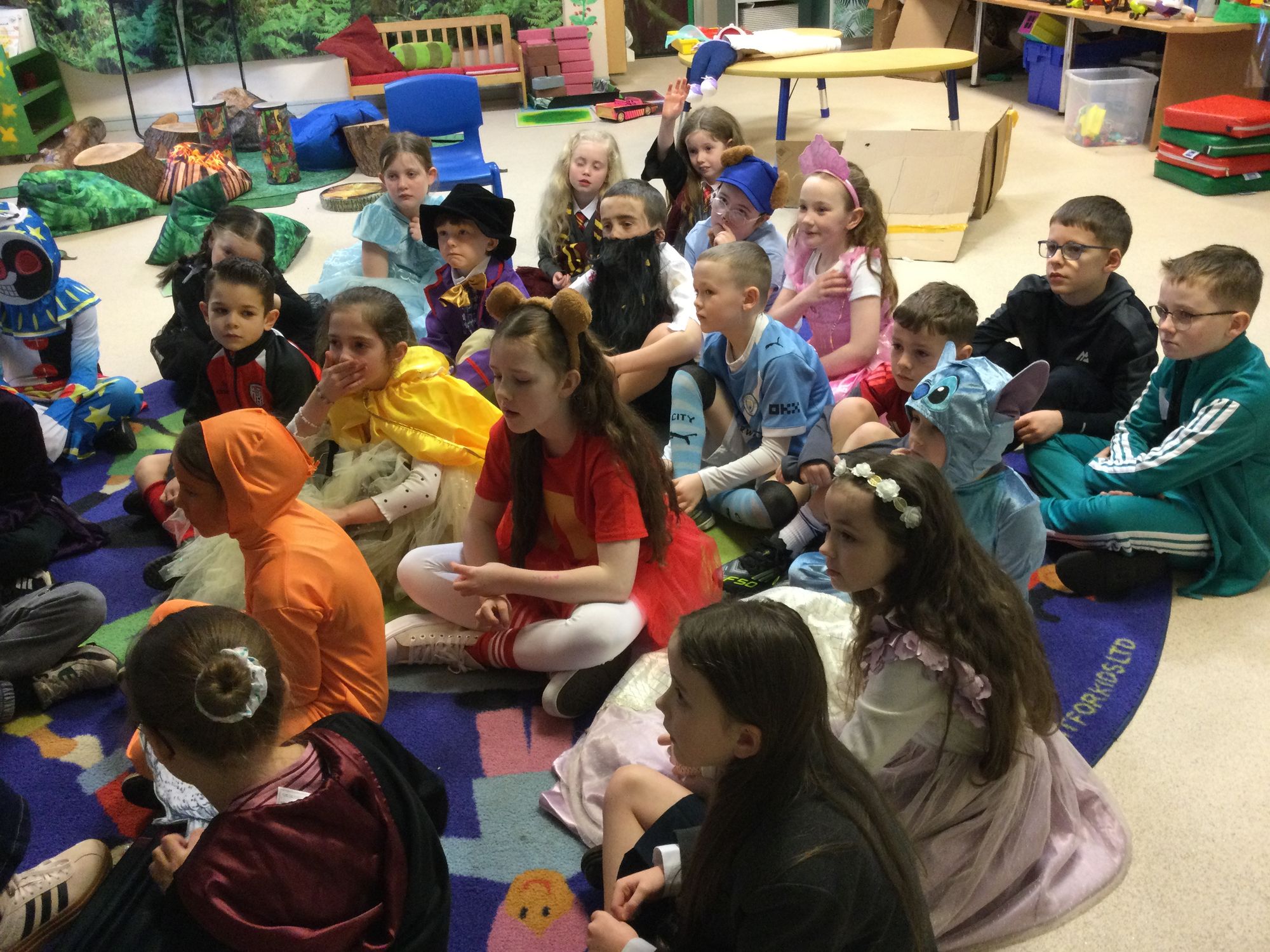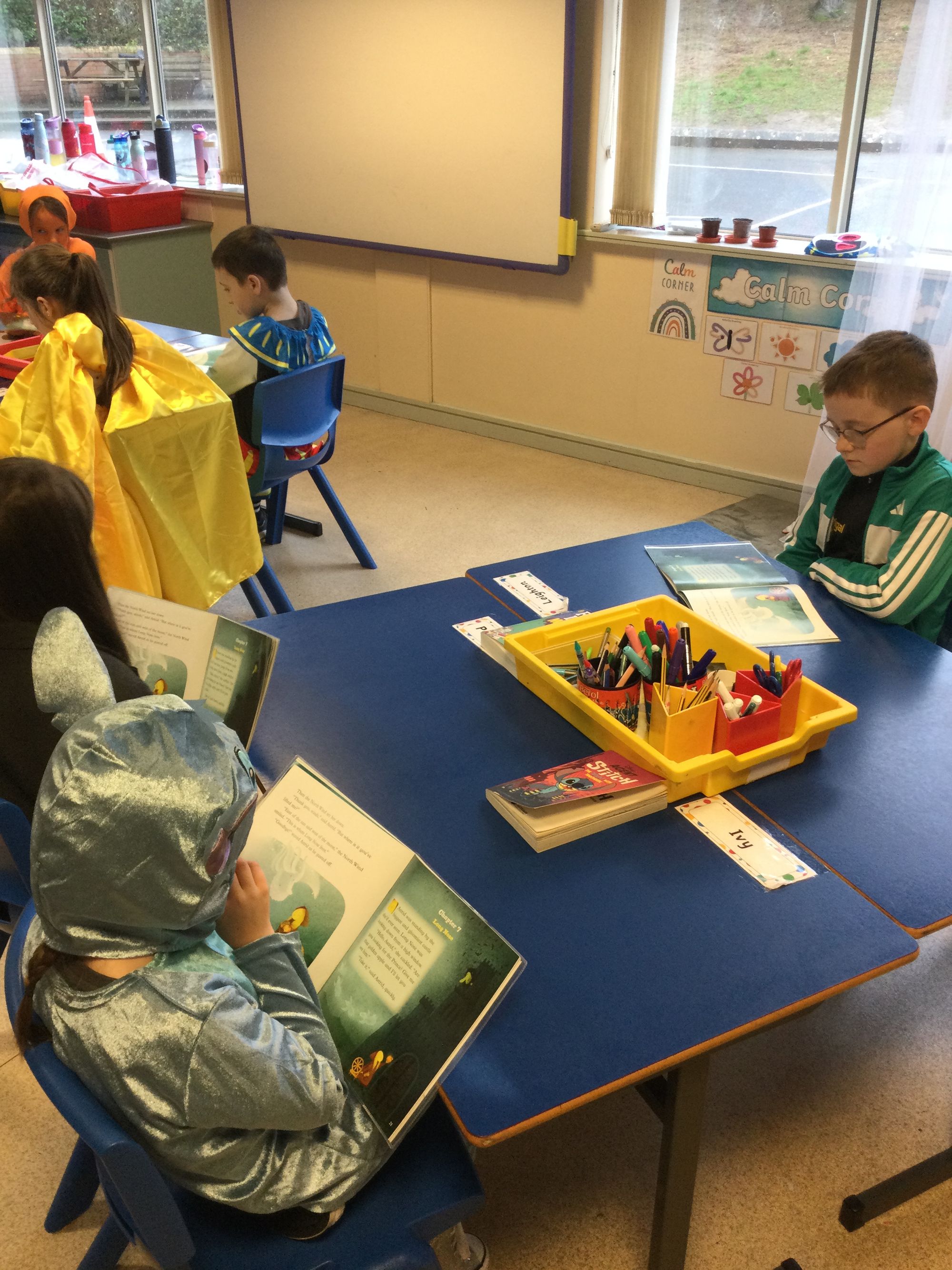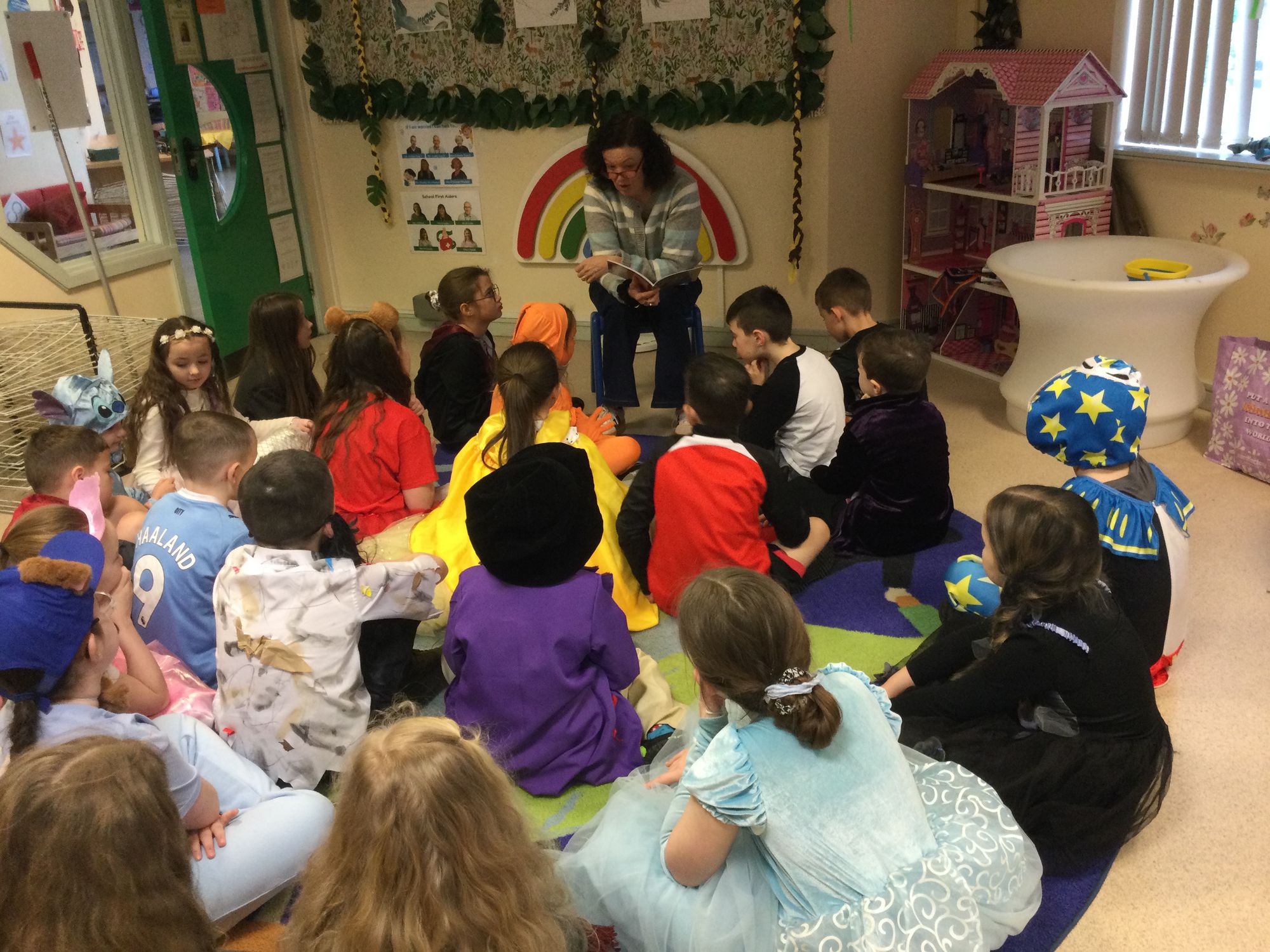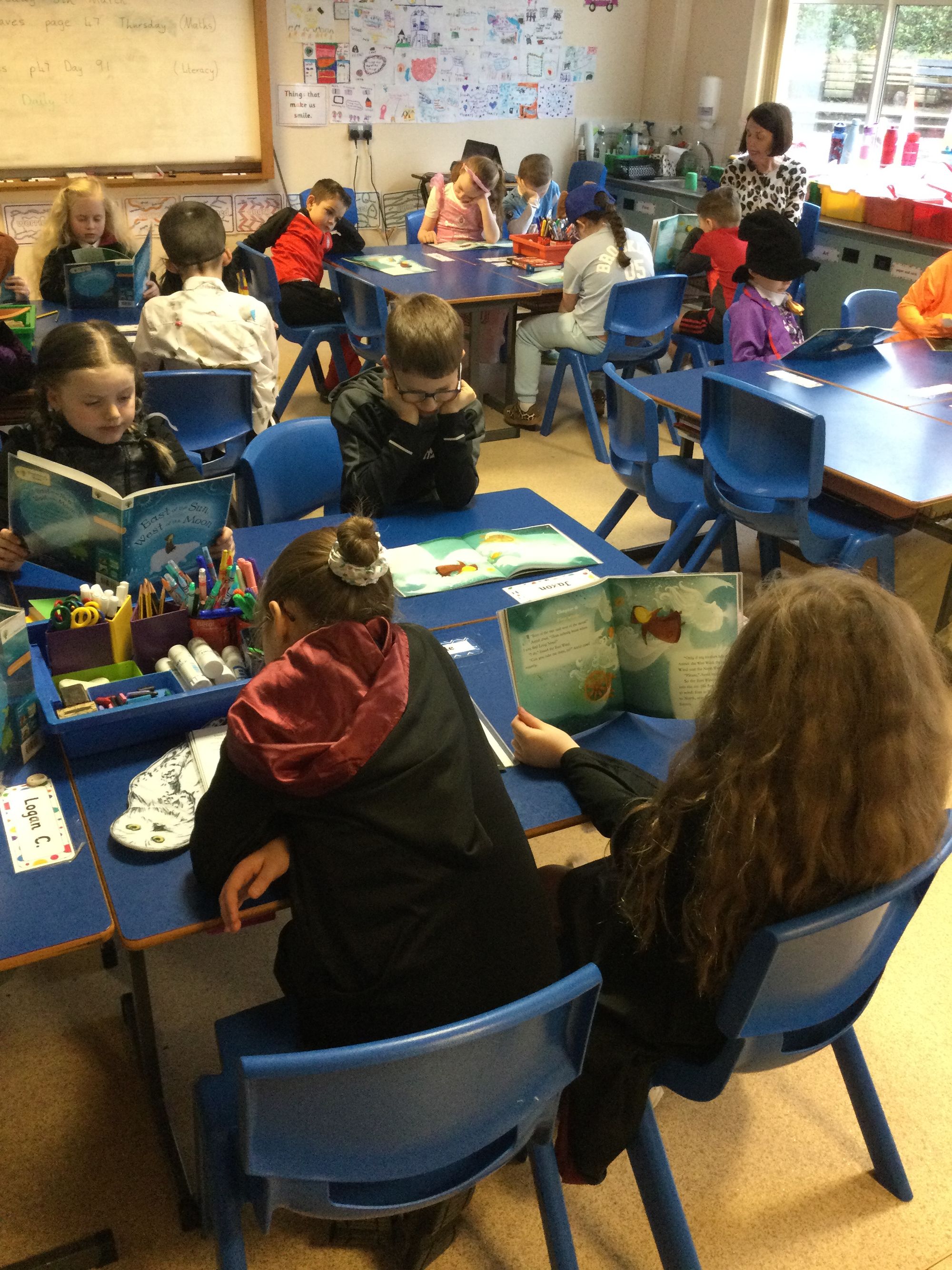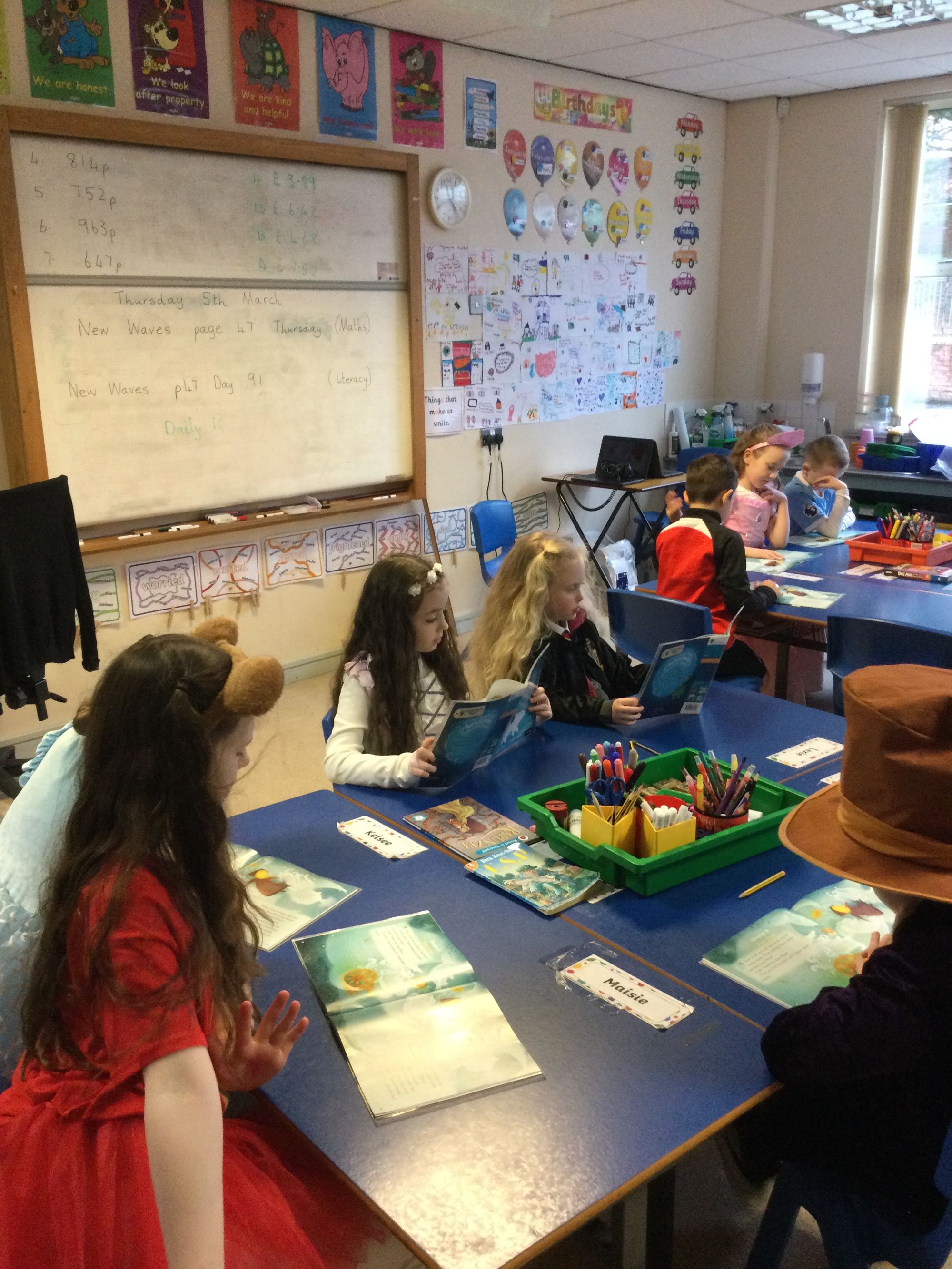 World Book Day in Year 4A. Thank you to Mrs Bradley for reading stories and poems. Boys and girls, your costumes were fantastic.